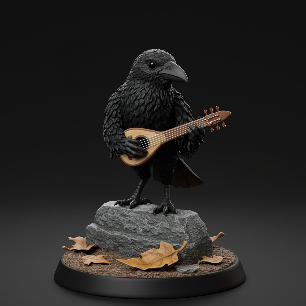 A finely crafted miniature of a kenku crow in a DnD game setting, capturing intricate details and sharp focus, with glossy black feathers and bright, intelligent eyes. The kenku stands poised on a small, weathered stone, surrounded by scattered leaves and a hint of moonlight casting subtle shadows. The feathered creature clutches a tiny, ornate lute, suggesting its mimicry abilities, blending mystery with an air of mischief. The scene evokes a sense of enigma and adventure, inviting players into a world of fantasy and imagination, set against a dramatic 3:4 aspect ratio backdrop.