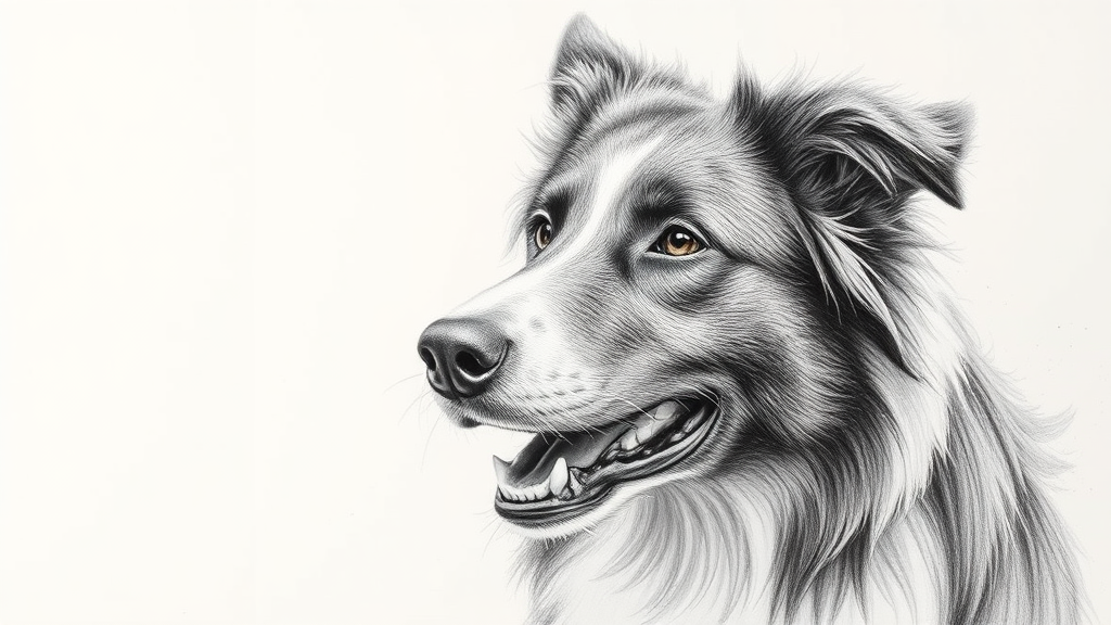 A finely detailed pencil sketch of a border collie dog, exquisitely crafted to capture intricate textures and a lively expression, the portrait appears in sharp focus as if a studio photo, evoking the artistic precision seen in works trending on ArtStation, influenced by the style of Greg Rutkowski. The background has subtle abstract elements, adding an element of whimsy and creativity while maintaining the essence of the subject's intelligent and energetic nature.