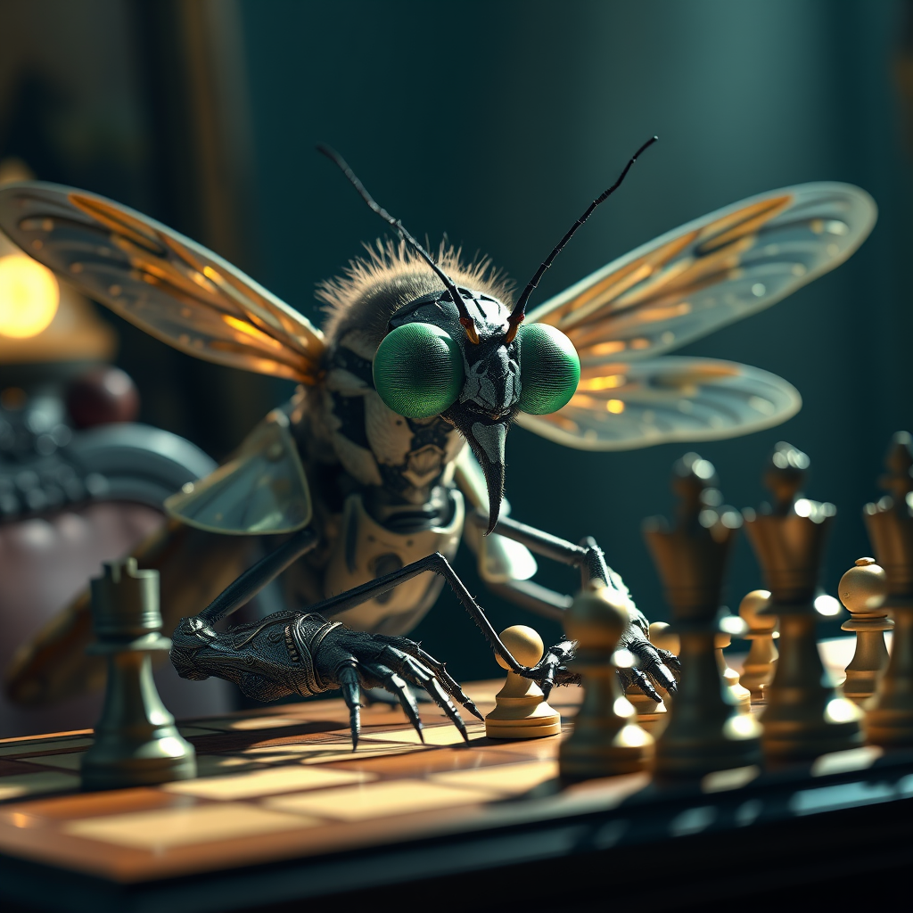 A finely detailed portrait of a mosquito with big green eyes, sitting at a table immersed in a game of chess, its delicate wings intricately depicted and glistening under the light. The mosquito wears an intricately designed set of armor that gleams with an iridescent sheen, lending a cinematic quality to the scene. The chess pieces are carved with exquisite detail, casting tiny shadows on the tabletop, while the ambient glow from a nearby lamp enhances the atmosphere, highlighting the mosquito's focused expression and the drama of the strategic game unfolding.