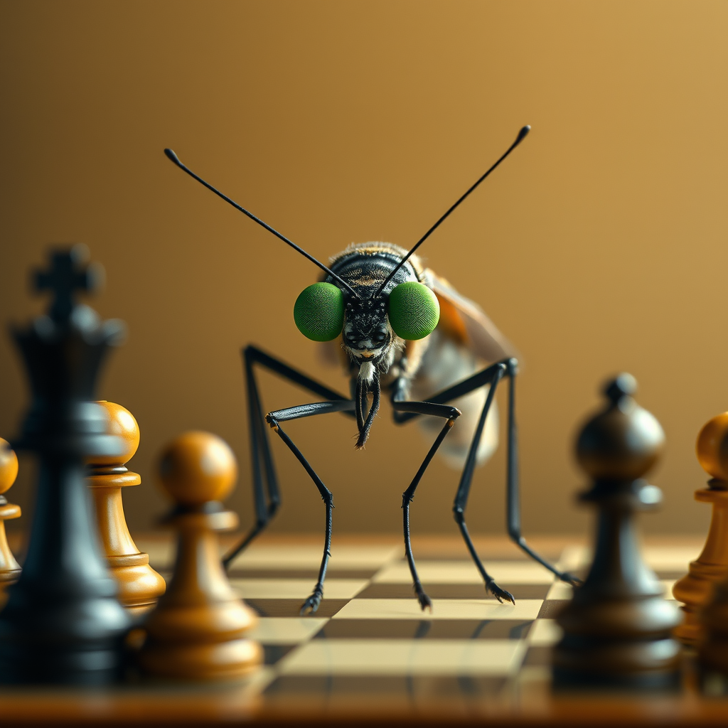 A finely detailed portrait of a mosquito with big green eyes, sitting at a table playing chess, its delicate limbs poised carefully over the chessboard. The setting is cinematic, highlighting the intricate details of the mosquito's features and the glint of light reflecting off its miniature armor. The scene captures a sense of intensity and concentration, with every piece on the board meticulously arranged, framed by the mosquito's determined yet contemplative gaze. The background is softly blurred, emphasizing the insect's unexpected prowess in this intellectual duel.