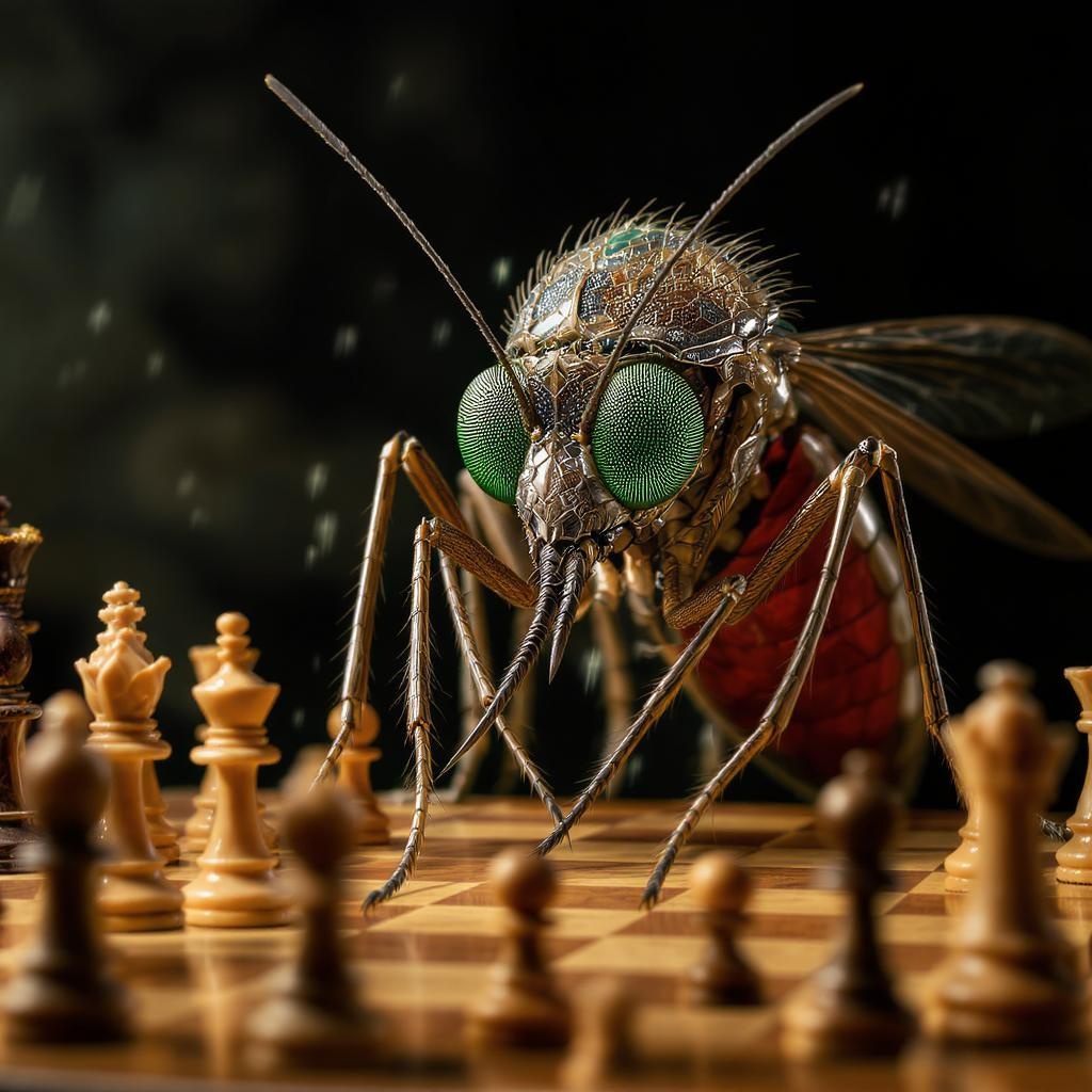 A finely detailed portrait of a mosquito with big green eyes, clad in intricate armor, sitting at a table deeply engaged in a game of chess. The scene is cinematic, with the mosquito's delicate wings shimmering in the light. The chessboard is meticulously detailed, each piece carved with elaborate designs, reflecting the mosquito's concentration and strategic thinking. The setting is infused with a touch of whimsy, blending the everyday with the extraordinary as the armored insect contemplates its next move in this surreal and captivating tableau.