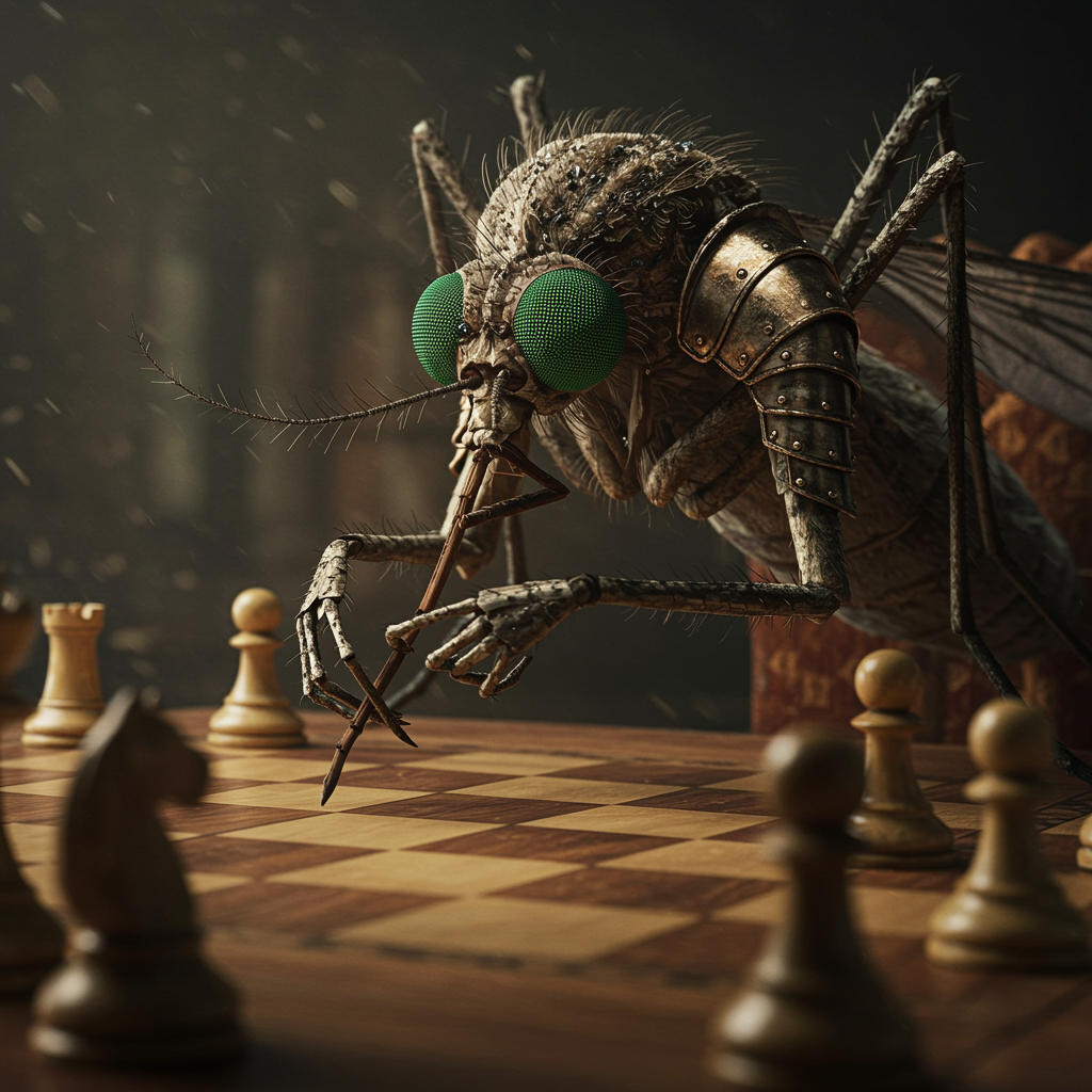 A finely detailed portrait of a mosquito with big green eyes, dressed in intricate armor, sitting strategically at a table playing chess. The scene is cinematic, with a focus on the mosquito's delicate yet commanding presence, its minute features captured in elaborate detail, against the backdrop of a chessboard with pieces arranged meticulously, hinting at a game in progress. The atmosphere is intense yet surreal, blending the unexpected elegance of the mosquito with the refined complexity of the game.