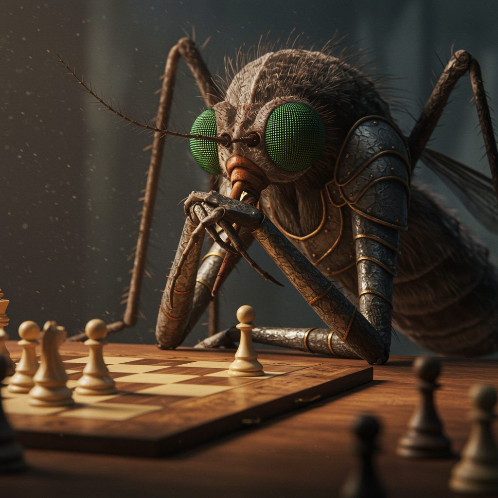 A finely detailed portrait of a mosquito with big green eyes, dressed in intricate armor, sitting at a table immersed in a game of chess. The scene is cinematic, with soft lighting highlighting the mosquito's delicate features and the intricate patterns on its armor. The chessboard is partially visible, with pieces arranged strategically, adding an element of intellectual challenge. The overall atmosphere is one of curiosity and contrast, as the tiny creature engages in a thoughtful and unexpected pastime.