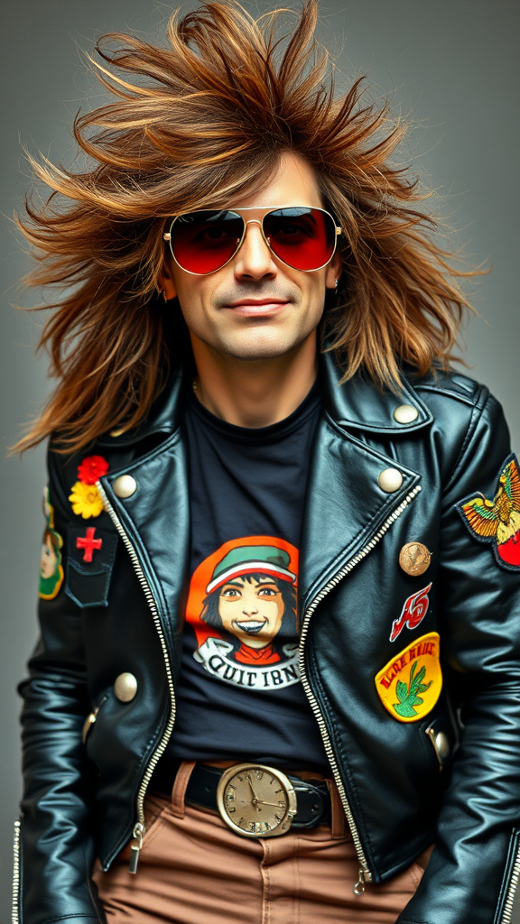 A flamboyant 60s rocker with a wild, flowing mane and oversized aviator sunglasses, sporting a mischievous smirk. He's clad in a black leather jacket adorned with colorful patches and gleaming metal studs, paired with flared pants and a vintage band tee peeking through.