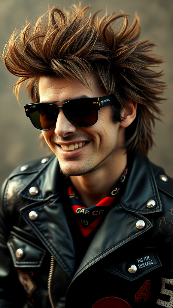 A flamboyant depiction of a vintage 60s rockstar featuring a wild, untamed rocker haircut and bold, retro sunglasses, with an infectious smirk playing on his lips. He's clad in a black leather jacket, adorned with gleaming metal studs, exuding an aura of rebellious charisma. A hint of psychedelic flair is introduced with colorful patches and a vibrant patterned bandana peeking from his pocket, adding an unexpected twist to his classic rocker ensemble.