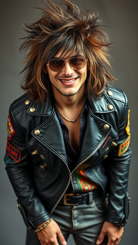 A flamboyant portrayal of a 60s rock icon, his wild, tousled hair cascading down to his shoulders, crowned with an edgy pair of shaded aviators that mask his mischievous eyes. His lips curl into a playful smirk, exuding an air of devil-may-care charisma. Clad in a worn-in, black leather jacket adorned with glistening metal studs, the ensemble is punctuated with a burst of colorful patches that speak to his eclectic spirit. His tight, faded jeans and scuffed boots add a touch of rebellious grit to his timeless rocker persona.