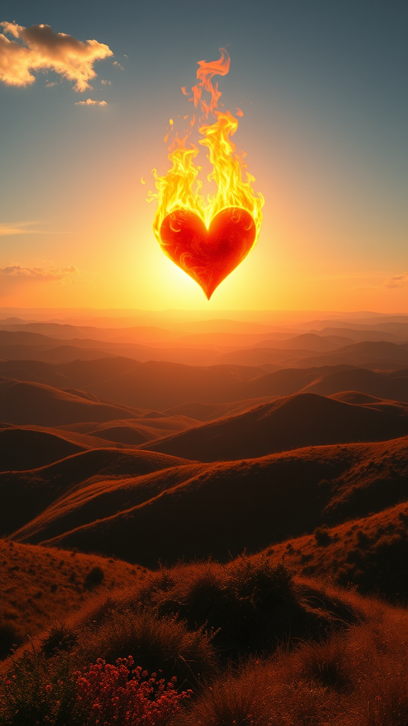 A flaming heart rises above a spicy, sunlit landscape, casting passionate hues over rolling hills.