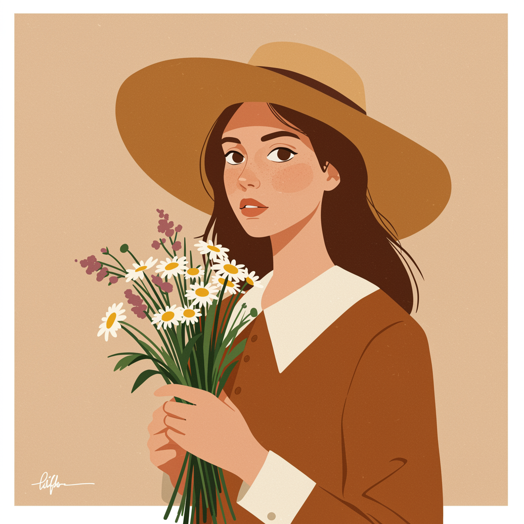 A flat illustration featuring a young woman in a wide-brimmed hat, clutching a bouquet of wildflowers, rendered in a minimalist and geometric style with a warm color palette inspired by Danish design principles, emphasizing simple and utilitarian elegance.