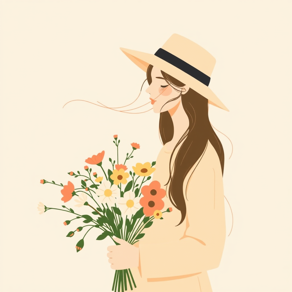 A flat illustration of a young woman in a simple, stylish hat holding a bouquet of flowers, featuring minimalist design with warm tones, a focus on function and form, utilizing geometric shapes, inspired by Danish aesthetics, with subtle creative elements such as a gently swirling breeze and a hint of shadow play, evoking serenity and balance.