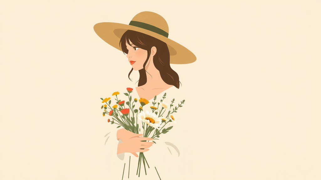 A flat illustration of a young woman in a wide-brimmed hat gently clasping a bouquet of wildflowers, styled minimally with an emphasis on warm earth tones and utilitarian simplicity; features clean, geometric lines influenced by Danish design aesthetics, set against a soft, muted background with subtle textural elements that add depth and character without detracting from the simplicity.