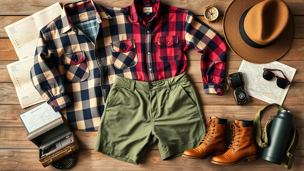 A flat lay arrangement of vintage 1960s camping attire, showcasing a collection of items such as a plaid flannel shirt, olive green cargo shorts, a classic canvas backpack, a pair of sturdy leather hiking boots, and a wide-brimmed fedora. Nearby, include an authentic compass, a retro map, a thermos with an old-school design, and a pair of vintage sunglasses, all set against a natural wooden background, capturing a photorealistic essence with warm, nostalgic tones.