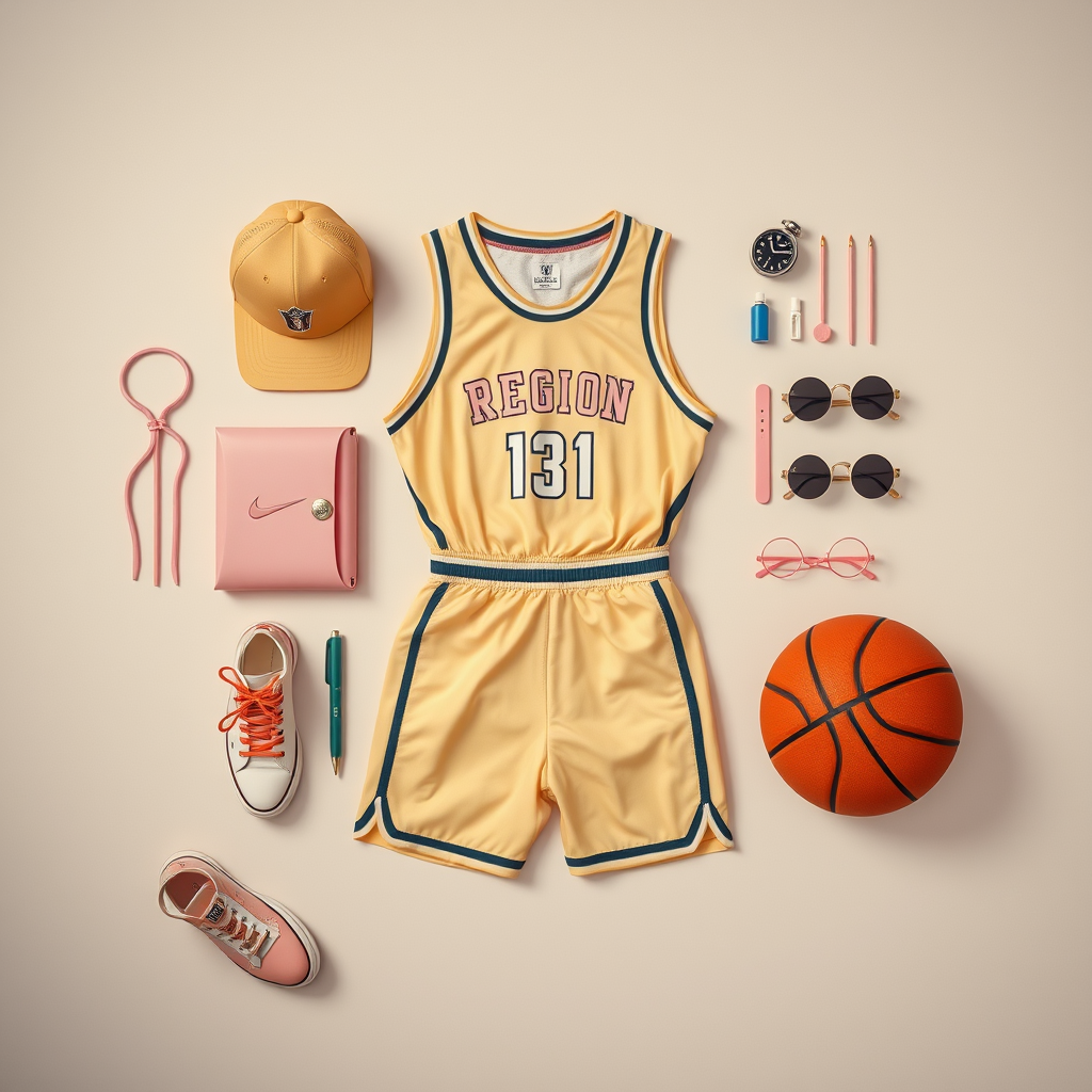 A flat lay composition showcasing a retro basketball outfit meticulously organized, featuring a Wes Anderson-inspired color palette with muted tones and pastel accents; the scene is illuminated with soft studio lighting to create a gentle ambiance, capturing the vintage aesthetic in high resolution for a clear and detailed 8k image, all arranged in a subtly harmonious layout.