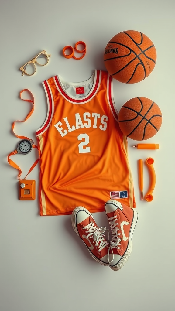 A flat lay photograph of a retro basketball ensemble arranged meticulously, featuring items like a classic jersey, worn sneakers, and a vintage basketball. The color palette evokes the whimsical tones of a Wes Anderson film with soft pastel hues and elegant orange accents. The scene is illuminated with studio lighting that creates an even, ambient glow. The overall image has a low contrast, capturing fine details in high resolution, showcasing the textures and colors harmoniously with an aspect ratio of 4:5 and a quality resolution.