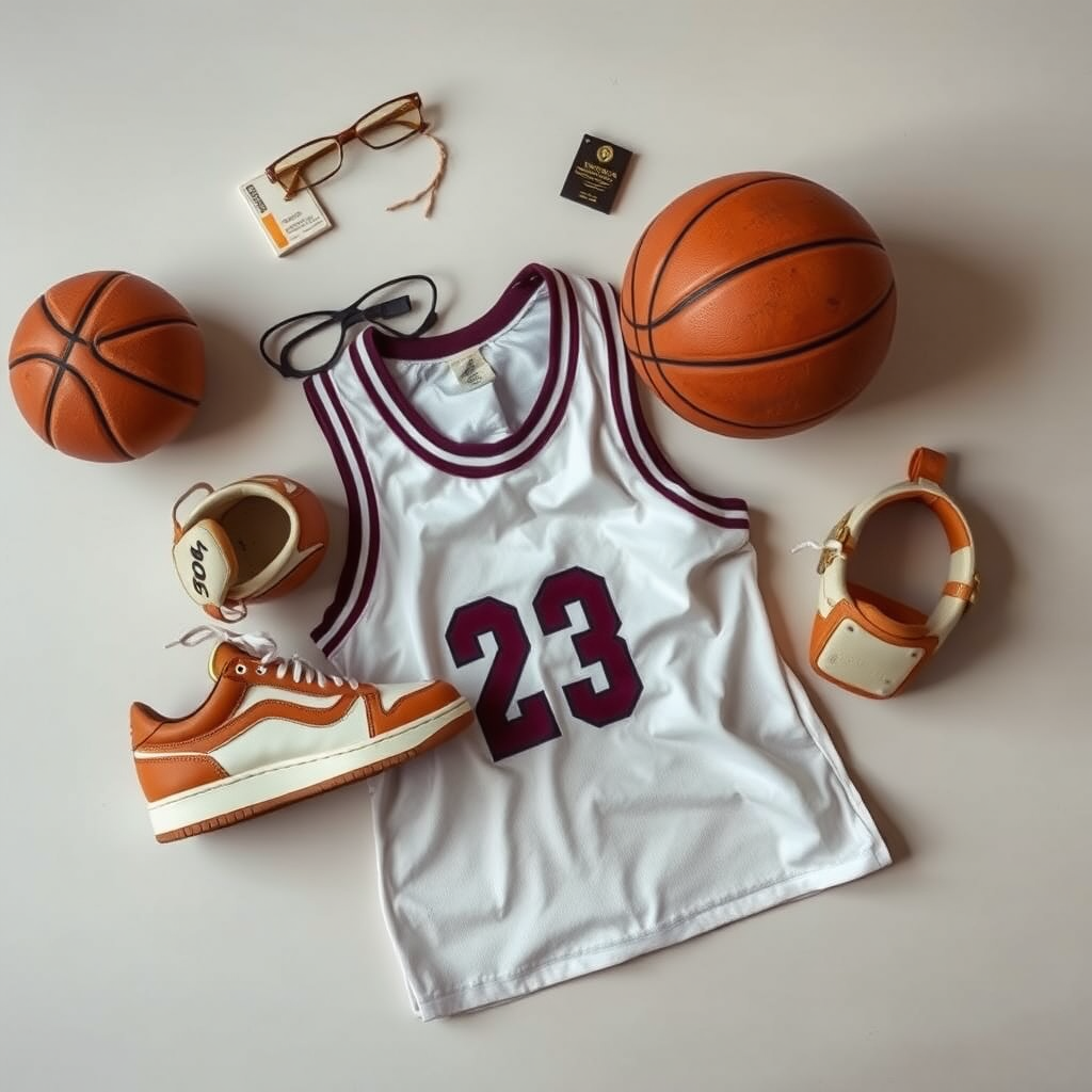 A flat lay photograph of a vintage basketball outfit arranged with precision, showcasing elements like retro sneakers, a worn leather basketball, and a classic jersey, all set against a muted pastel backdrop reminiscent of a Wes Anderson color palette. The composition is captured with soft studio lighting to highlight textures and details, maintaining a subtle and harmonious low contrast. The image boasts an ultra-high-definition resolution, drawing attention to the intricacies of each item, and is thoughtfully framed in an aspect ratio of 4:5 for a balanced visual appeal.