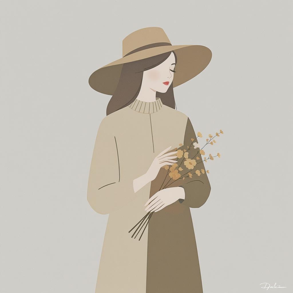 A flat minimalist illustration of a girl with a wide-brimmed hat, gently clutching a bouquet of wildflowers, her attire embodying warm, earthy tones with a utilitarian and geometric aesthetic, inspired by Danish design principles, characterized by clean lines and subtle elegance.