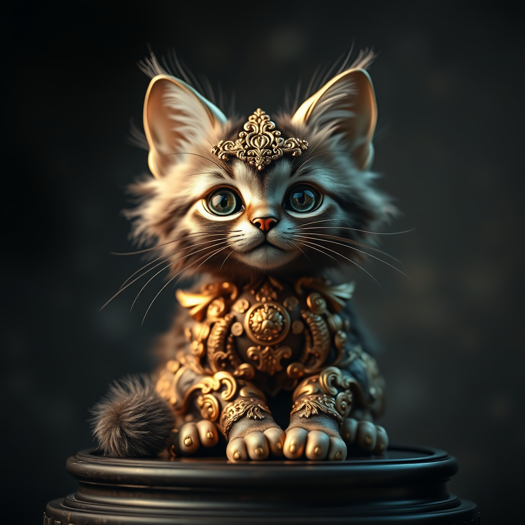 A flawlessly detailed gold clockwork kitten intricately adorned with golden filigree, set against a dramatic, dark abstract background. The scene exudes a chiaroscuro effect, with mesmerizing highlights and shadows enhancing the photorealism. The composition embodies hyper realism with a sense of dynamic acceleration, captured in 8K and HD super resolution. The image possesses a cinematic quality, enhanced by a long-exposure effect that imparts a sense of motion, maintaining a balanced and square aspect ratio.
