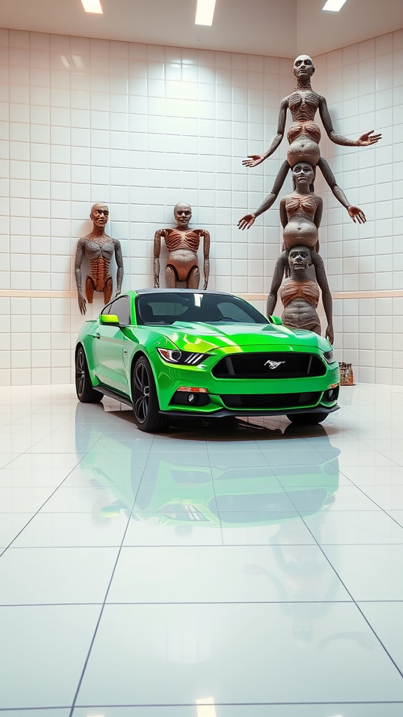 A flawlessly lit room with pristine white tiles showcases a metallic green Ford Mustang reflecting perfect orange hues under bright lights. Surrounding it, pastel colors add a soft touch, enhancing the car's vibrant presence. The scene boasts intricate details captured in 8k ultra-realistic resolution, suitable for commercial photography. While capturing this mechanical beauty, the composition includes a surreal twist: a totem pole of stacked torsos featuring whimsically mutated forms and floating limbs. This peculiar arrangement possesses a bizarre yet fascinating aura, highlighted by professional color grading, embracing the unprecedented fusion of beauty and the grotesque.