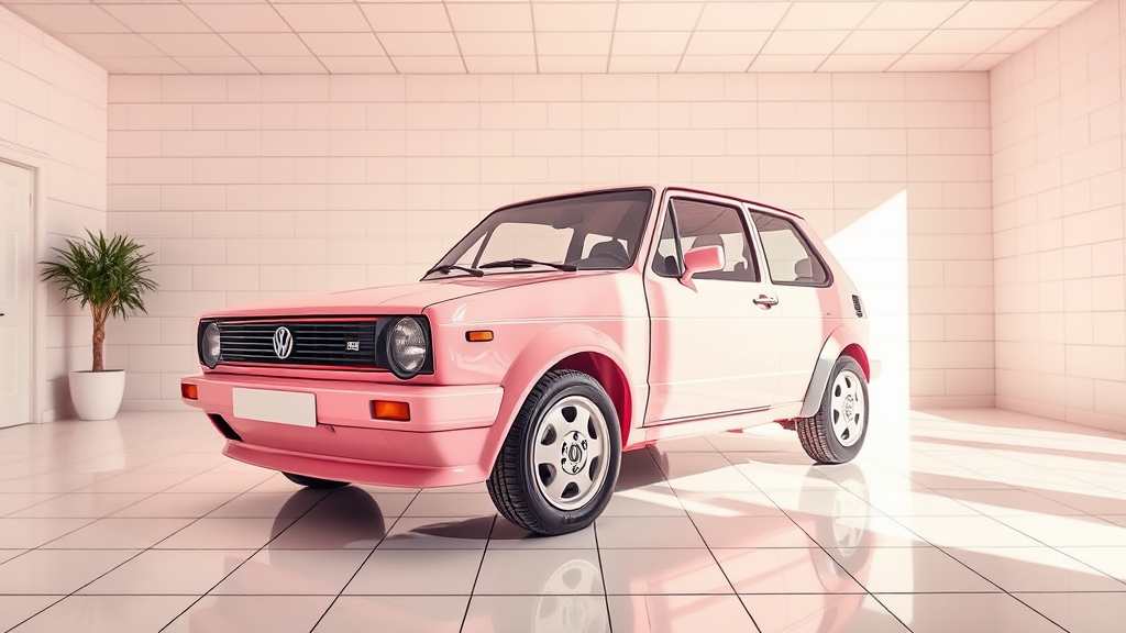 A flawlessly white-tiled room houses a pastel pink Volkswagen Golf Mk2 GTI, showcasing a perfect pink hue under bright, vibrant lighting. The scene is richly detailed, featuring an ultra-realistic portrayal akin to commercial photography, with a focus on fine details and professional color grading. The environment exudes a harmonious blend of pastel colors, emphasizing the vehicle's sleek design and timeless appeal, captured in high-resolution 8k quality, maintaining a slightly elongated 4:5 aspect ratio to accentuate the car's unique aesthetic charm.