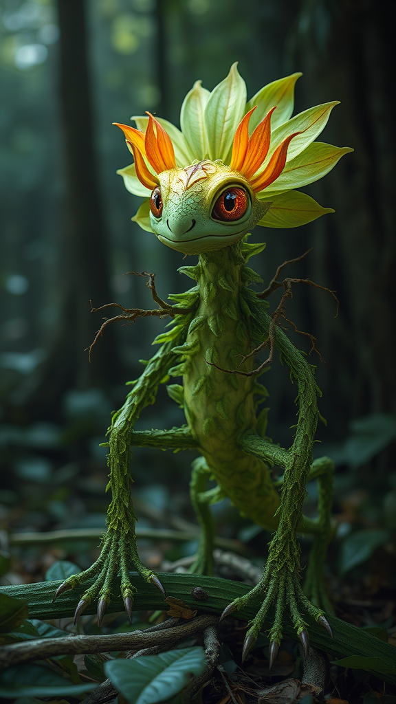 A Florent is a fantastical hybrid creature, blending the essence of both animal and plant. Its body is an intricate tapestry of soft, verdant leaves and slender branches, delicately draped over a transparent, thin layer of skin. This unique covering serves as both armor and camouflage in its lush environment. The Florent's four elongated limbs are sheathed in vibrant foliage, which grants it the agility to dart swiftly across the forest floor. At the tips of its limbs, viciously sharp claws unfurl, essential tools for gripping and seizing prey. Perched atop its body is an impressive, flower-like head, crowned with vividly colored petals that serve to distract and enchant onlookers. Beneath this floral facade, two large, luminous eyes pierce the darkness, their bioluminescence allowing unparalleled night vision. A keenly honed nose punctuates its visage, an invaluable asset for detecting prey and exploring its surroundings. Though the Florent cannot sustain high-speed chases over extended distances, it possesses an extraordinary ability to capture breezes and float gracefully through the air. Its root-like extensions anchor into the soil, drawing nourishment from its environment. This creature embodies a symbiotic dance between the animalistic and the botanical, a captivating blend of elegance and ferocity, 8k ultra realistic.