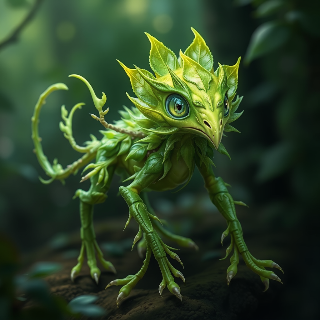 A Florent is an enchanting creature, a mesmerizing fusion of animal and plant. Its body, a tapestry of soft, verdant leaves interwoven with delicate branches, conceals a slender layer of skin beneath. The Florent stands on four elongated limbs, each cloaked in lustrous green leaves, granting it the agility to sprint effortlessly across the forest floor. From the tip of each paw extend razor-sharp claws, adept at capturing oblivious prey. Its head blooms like a captivating flower, crowned with large, luminescent eyes that pierce the darkness with an ethereal glow. A keen and pointed nose protrudes from its floral visage, finely tuned to detect the faintest scents of its environment. Although not built for long-distance travel, the Florent exhibits a unique adaptation: it unfurls its leafy appendages to glide gracefully on the wind's currents. When the time calls for stillness, it employs tendrils that burrow into the earth, drawing sustenance from the soil. The Florent's gentle radiance and captivating amalgamation of plant and beast create a stunningly unique presence in its woodland realm. 8k ultra realistic, --ar 4:5 --q 2.