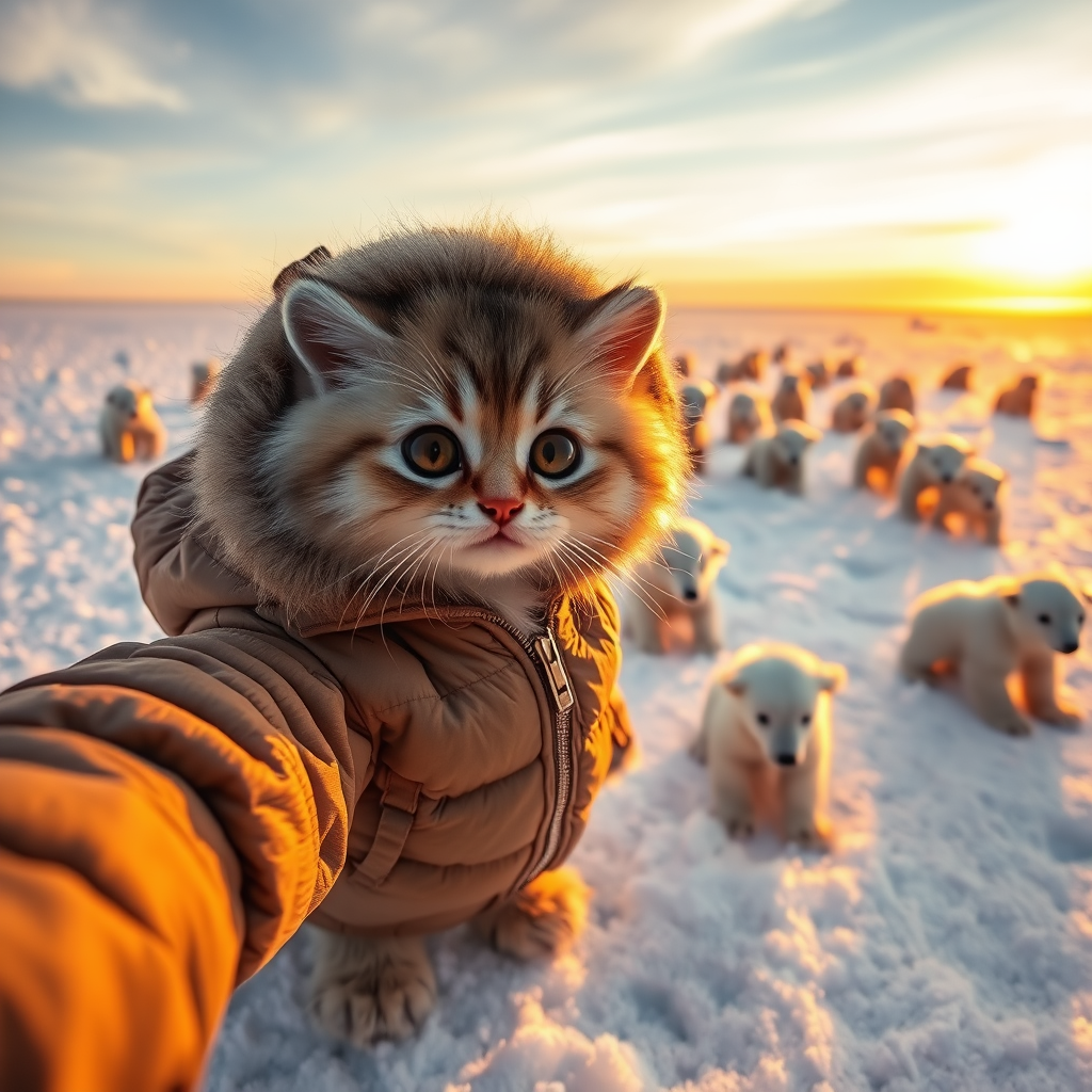 A fluffy baby cat with a long, luxurious coat and big, expressive eyes poses for a selfie on a vast, snowy ice field. The cat is snug and warm in a tiny, cozy brown down jacket and matching hat with ear flaps. The sun casts a golden glow across the scene, illuminating the delicate features of the cat and the pristine landscape. Around the cat, more than ten playful polar bear cubs frolic, their soft white fur reflecting the warm sunset light. The scene is hyper-detailed, capturing the whimsical charm of the cat and the gentle majesty of the young polar bears in their natural habitat.
