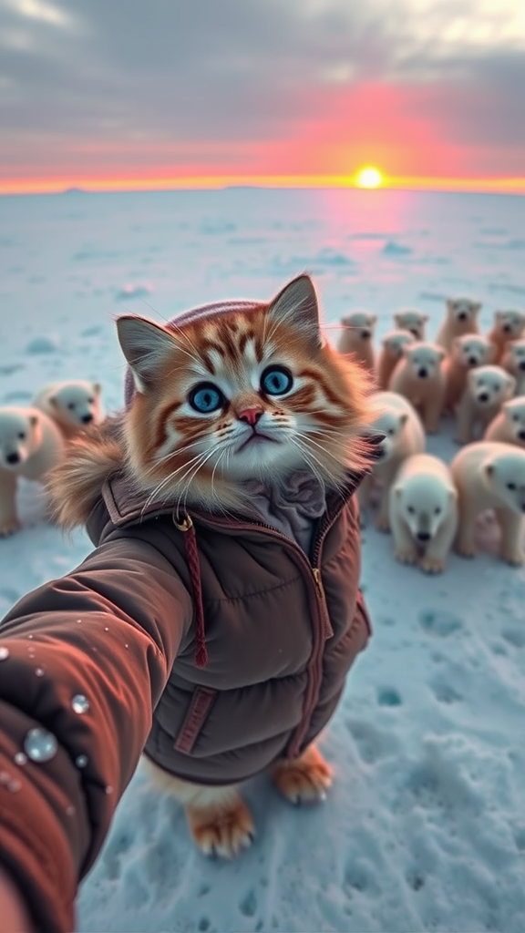 A fluffy baby cat with big, expressive eyes and long fur, wearing a cozy brown down jacket and matching hat, stands in the middle of a vast ice field surrounded by a playful group of over ten small, curious polar bears. As the cat tilts its head slightly, capturing a selfie with the rosy glow of a setting sun casting a warm light over the scene, each detail is vividly highlighted, from the shimmering snowflakes in the crisp air to the bears' soft white fur. The cat's playful charm and the serene Arctic landscape create a captivating and whimsical moment.