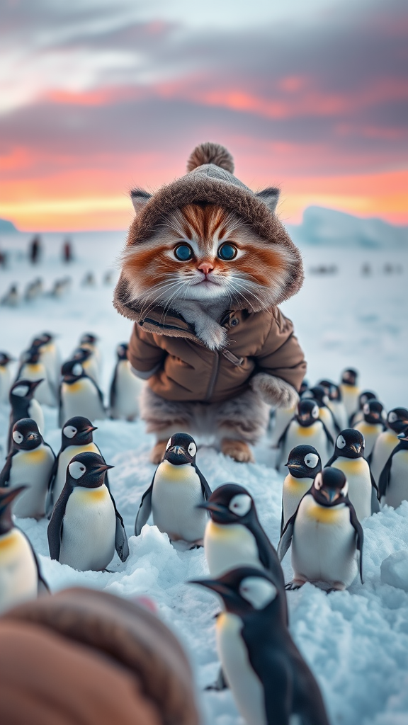 A fluffy baby cat with big, sparkling eyes and long fur wearing a cozy brown down jacket and a matching hat takes a selfie amidst an ice field blanketed in snow. Around the cat, over a dozen small black and white emperor penguins gather curiously, their sleek feathers glistening under the warm glow of the setting sun. The scene is hyper-detailed, capturing the pink and orange hues of the sunset light as it dances across the icy landscape, casting soft shadows and illuminating the joyful spirit of this unlikely gathering.