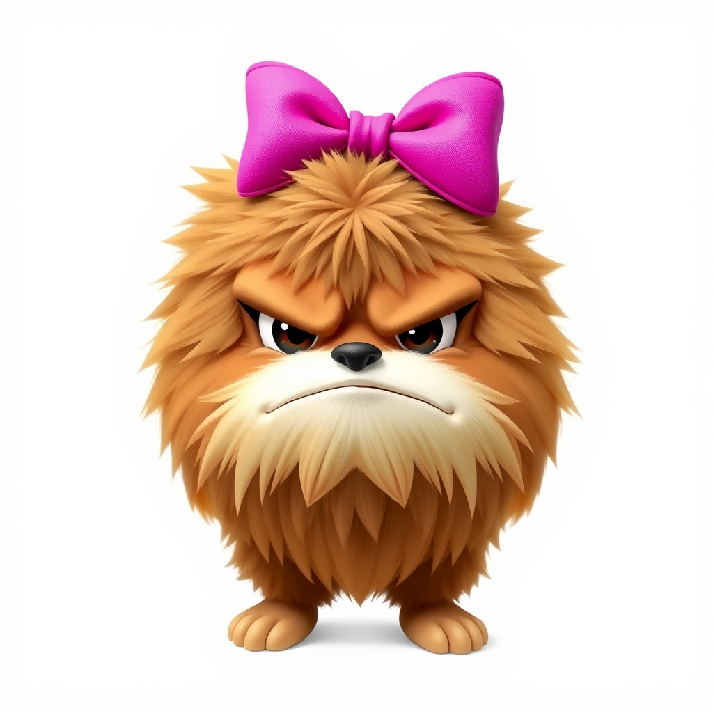 A fluffy, brown character with a wrinkled expression of distaste, adorned with a bright pink bow, stands out vividly against a plain white backdrop.