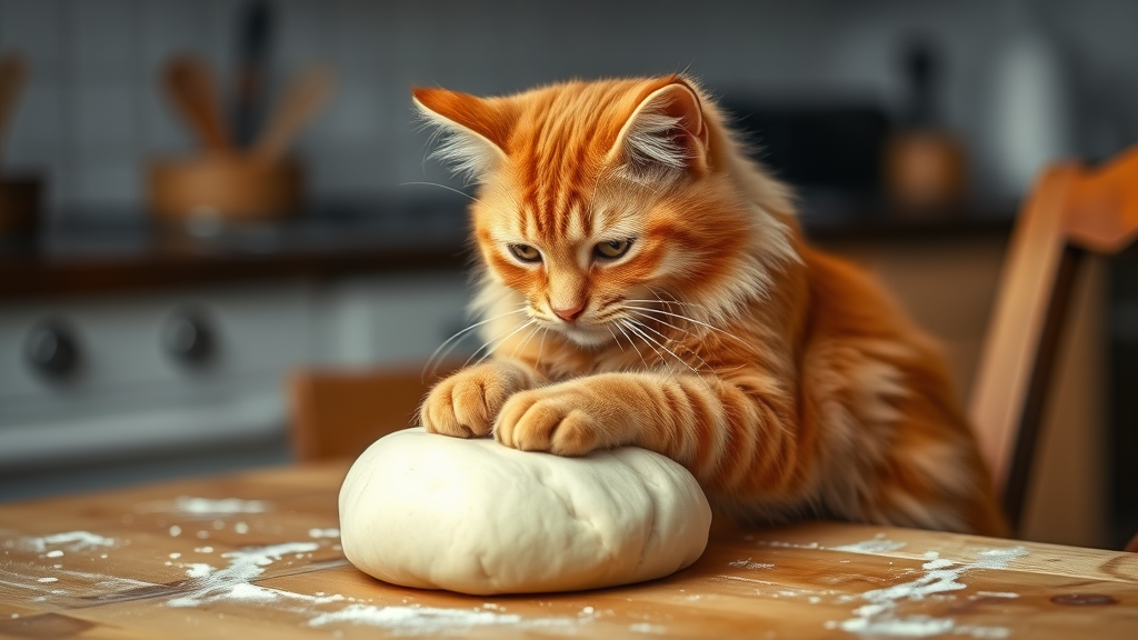 A fluffy ginger cat perched at a kitchen table, its whiskers twitching with concentration as it expertly works its paws into the soft, pliable dough, resembling a miniature baker lost in the art of bread-making.
