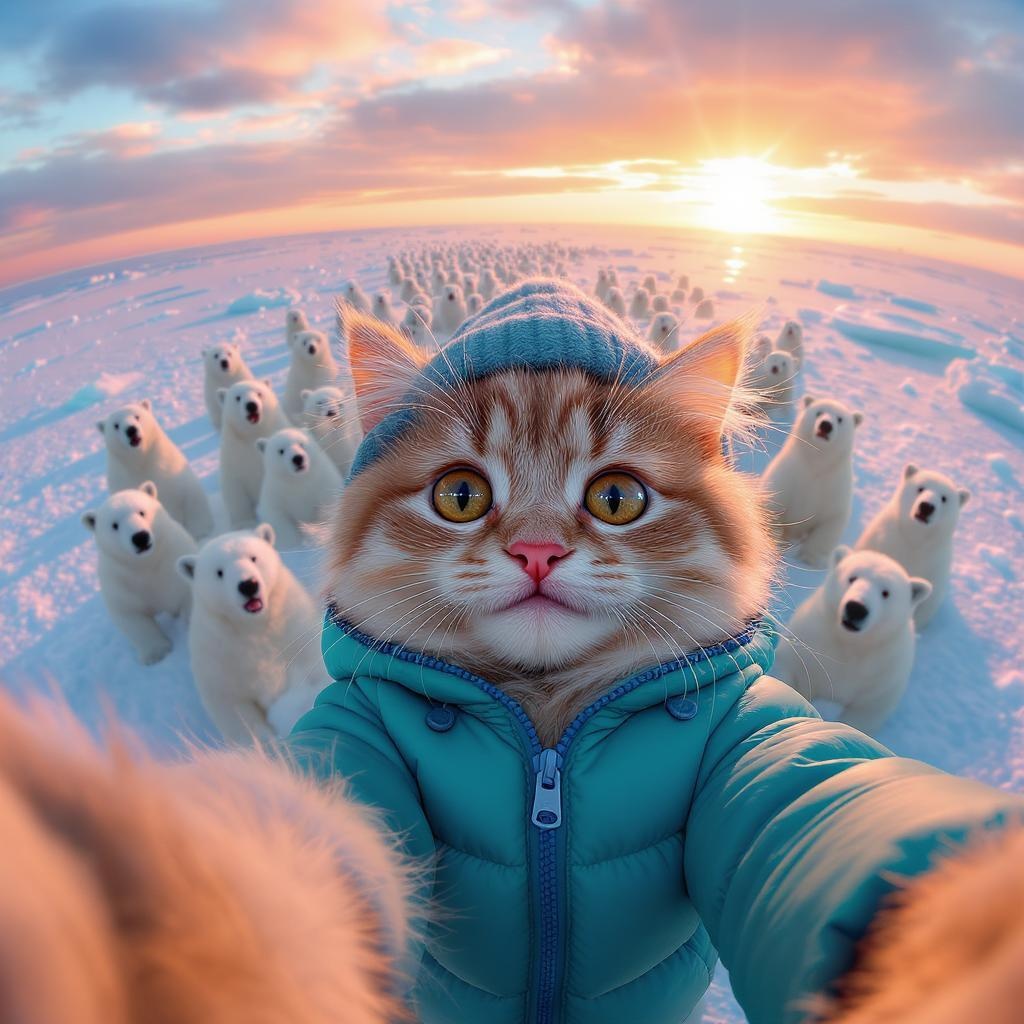 A fluffy kitten with big, sparkling eyes and a thick coat of fur, dressed in a snug, teal-colored down jacket and hat, takes a selfie amidst the vast expanse of a snowy ice field. Surrounding the kitten are over a dozen playful, pint-sized polar bears with soft white fur, their curious eyes twinkling in the warm glow of the setting sun. The scene is bathed in exquisite, hyper-detailed sunset light, casting a magical, rosy hue over this enchanting winter tableau.