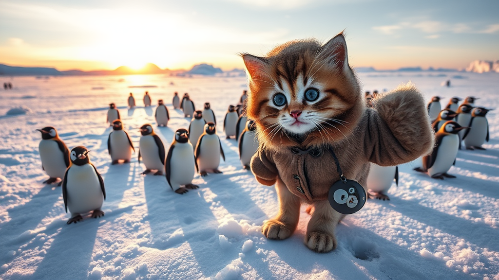 A fluffy kitten with strikingly large eyes and long, luxurious fur, adorned in a cozy brown parka and matching hat, snaps a playful selfie on a gleaming ice field under the warm glow of a setting sun. Around the kitten, a lively ensemble of over a dozen curious emperor penguin chicks in sleek black and white plumage waddle and chirp, casting tiny shadows on the shimmering snow. The scene is intricately detailed, capturing the magical contrast between the crisp cold of the ice and the soft warmth of the sunset's embrace.