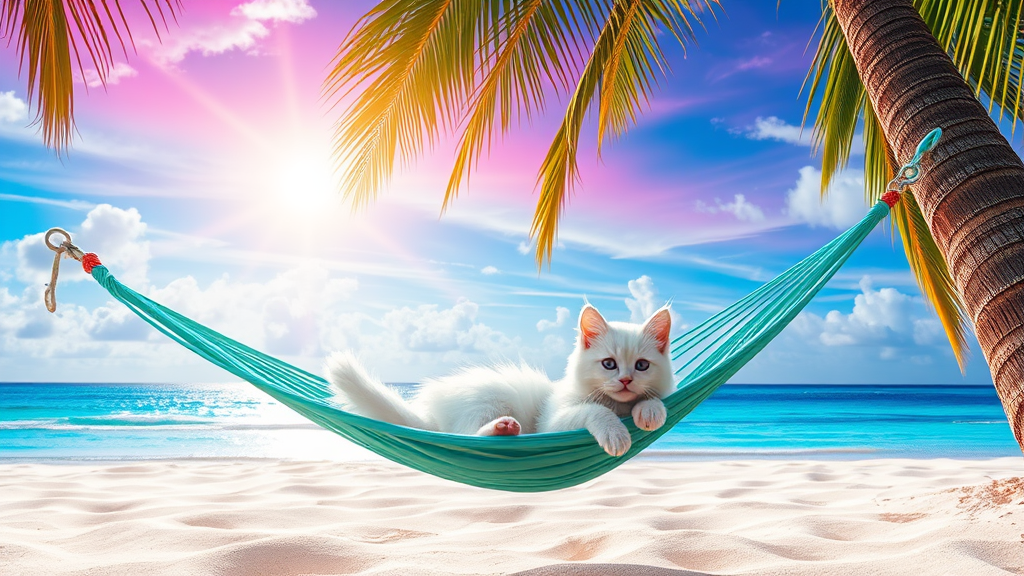 A fluffy white kitten lounges on a turquoise hammock gently swaying under the shade of a palm tree at a surreal, semi-transparent beach. The vibrant sky above is painted with hues of the rainbow, casting a magical glow over the scene. The sun's rays dance across the sand, creating a dream-like atmosphere that feels both ethereal and serene.