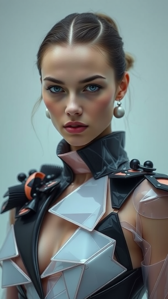 A focused female model gazes diagonally, adorned in avant-garde attire featuring a blend of plastic and latex materials. The outfit boasts a fusion of abstract geometric shapes and asymmetric techno embellishments, capturing the essence of Iris van Herpen's visionary style. The scene is captured in a 4k cinematic medium shot, emphasizing both the intricate details of the design and the model's intense expression. The ensemble's futuristic allure is heightened by the play of light on its unconventional textures and forms, creating a striking visual spectacle.