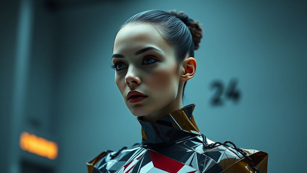 A focused female model gazing diagonally, adorned in avant-garde attire featuring a fusion of plastic and latex materials, highlighted by abstract geometric patterns and asymmetrical techno accents. The scene embodies the innovative spirit of Iris van Herpen, captured in striking 4k resolution as a medium shot with cinematic flair, conveyed through rich textures and futuristic artistry.