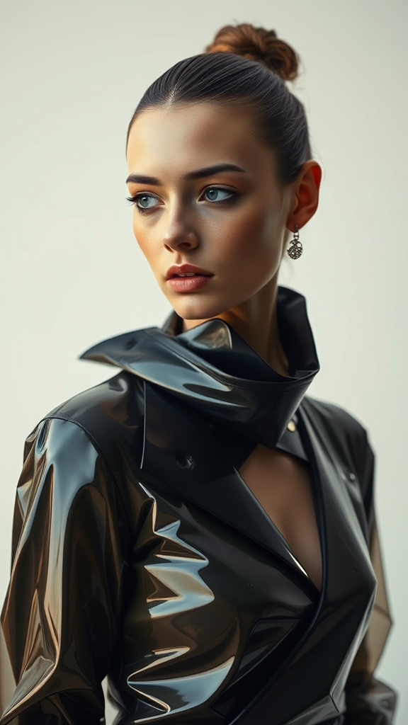 A focused female model glances diagonally, adorned in avant-garde and luxurious attire, incorporating innovative use of plastic and latex textures, with angular geometric designs and futuristic asymmetrical details, capturing the essence of high fashion in the style of Iris van Herpen, high-resolution, medium shot with a cinematic touch, emphasizing the blend of artistry and modernity.