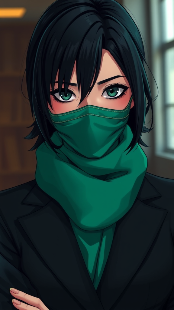 A focused woman with jet-black hair, wearing a sleek dark blazer and a vibrant emerald scarf, a cloth face mask covering her expression, designed in an anime-like 3D style with ultra-high-definition 8k quality, crafted using the unreal engine. The scene evokes a sense of intensity with a touch of mystery, captured in a portrait aspect ratio. The style leans towards an expressive, energetic vibe, full of subtle details and depth, maintaining a sophisticated and contemporary aesthetic.
