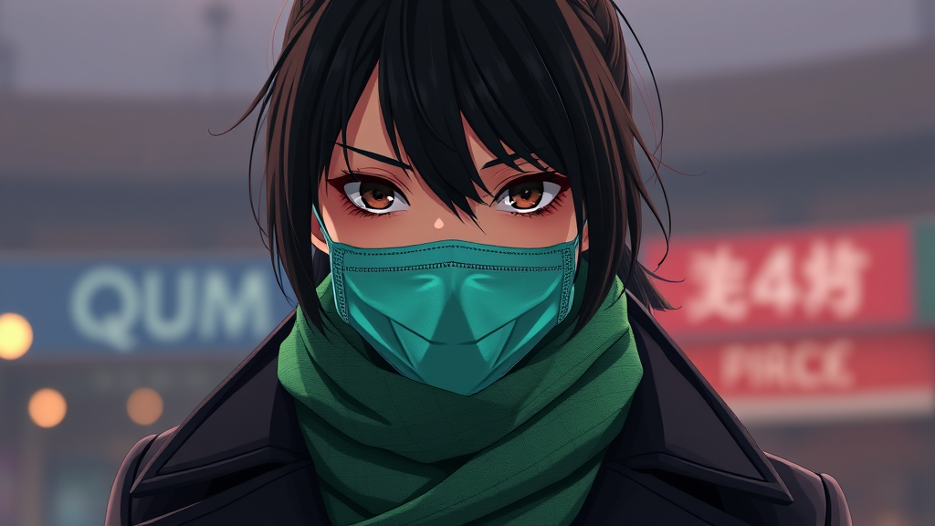 A focused woman with jet-black hair, wearing a sleek dark coat and a vibrant emerald scarf, paired with a cloth face mask. The scene is rendered in a high-detail anime style, using advanced 3D techniques and rendered in cinematic 8k quality. The image captures her in a dynamic, expressive pose, with a background that enhances her serious demeanor, utilizing Unreal Engine for a visually striking effect. The proportions are set to a dramatic 9:16 aspect ratio, with attention to vivid color contrasts and textural details for a captivating visual narrative.