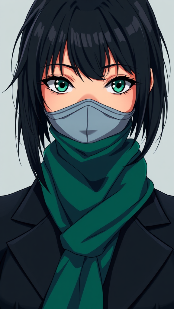 A focused woman with jet-black hair, wearing a tailored dark blazer and an emerald green scarf, has her face partially hidden by a sleek mask. Captured in anime-style 3D, rendered in 8K using Unreal Engine, the composition presents a visually striking image with an aspect ratio of 9:16. The piece is infused with an expressive style, bringing out the character’s intensity and depth, and set with a subtle aesthetic that enriches the narrative.