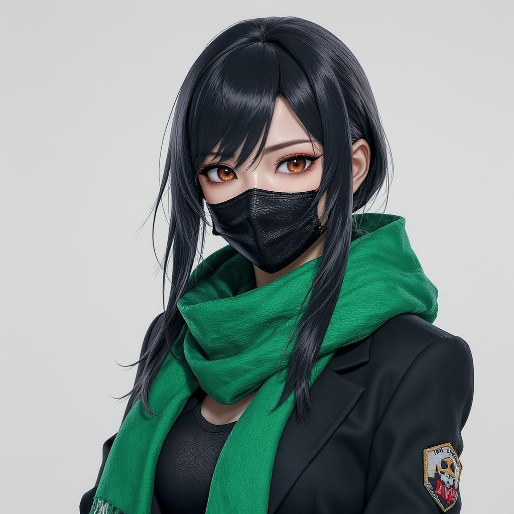 A focused woman with sleek ebony hair, wearing a structured dark blazer and a vibrant emerald scarf, cloth face mask, depicted in an anime 3D style, ultra-high-resolution 8k, rendered using an advanced graphics engine, with a vertical 9:16 aspect ratio, incorporating an expressive and dynamic artistic style with subtle creative enhancements.