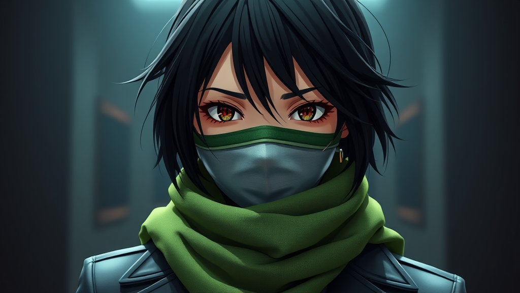 A focused woman with striking black hair, wearing a sleek dark jacket and a vibrant green scarf, her face partially covered by a cloth mask. Rendered in a high-quality anime-inspired 3D style, utilizing 8K resolution through the capabilities of Unreal Engine, she exudes an expressive aura. The composition embraces a dynamic vertical aspect ratio, enhancing the elegant presence of this intriguing character.