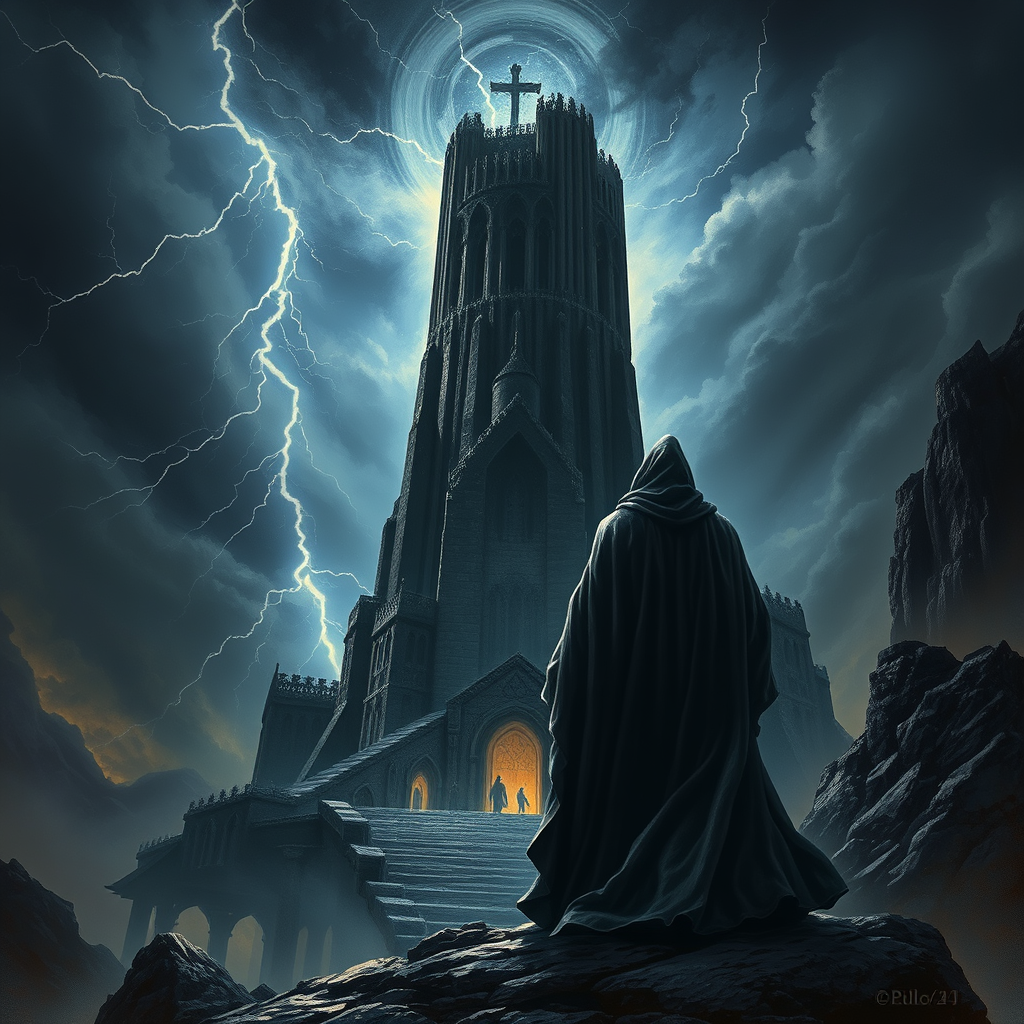 A foreboding night cloaked in mystery, a figure draped in flowing black robes approaches an imposing dark tower, crackling lightning illuminating the tempestuous sky. Encapsulating the essence of Dungeons and Dragons, rays of shimmering light dance around the scene, casting dramatic shadows and highlights. The artistry draws from the evocative styles of Bob Eggleton, Caspar David Friedrich, Doug Beekman, and Doug Chiang, presenting an ultra-high detail 8k close-up that captures the intense drama and intricate textures of the scene.