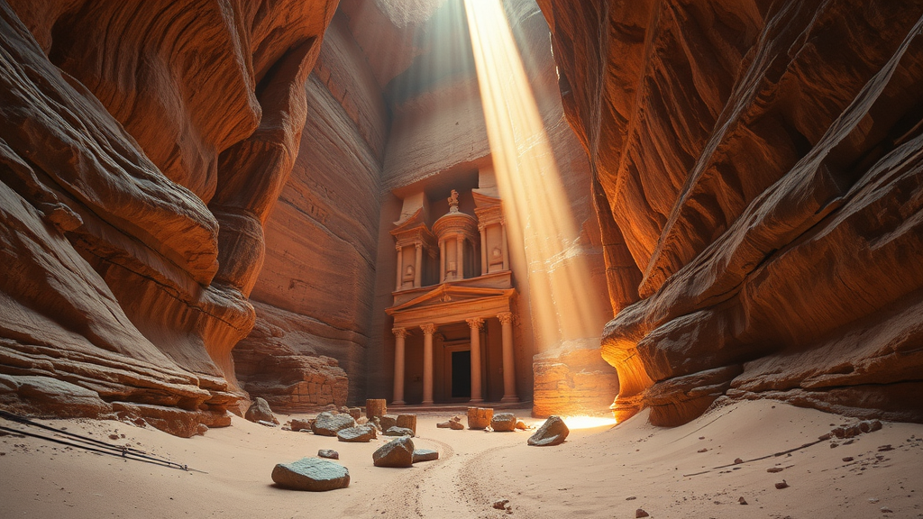 A forgotten Sumerian temple nestled within a towering canyon wall, its ancient stones weathered and strewn across the entrance in a desolate desert landscape. The scene is bathed in ethereal beams of light filtering from the canyon's rim high above, creating a dramatic interplay of shadow and illumination reminiscent of the majestic style of Petra. The environment is cinematic, with soft volumetric lighting enhancing the mystical aura of the temple ruins. Detailed textures in 16k UHD and HDR capture every nuance of the scene's intricate carvings and eroded surfaces. Subtle creative variations weave into the atmosphere—sands swirling gently in the faint desert breeze, while the light dances across the ruins, reflecting off ancient artifacts half-buried in the sands. The visual narrative invites a sense of wonder and discovery, immersing the viewer in the profound beauty of this hidden archaeological wonder, where history and nature converge in silent harmony.
