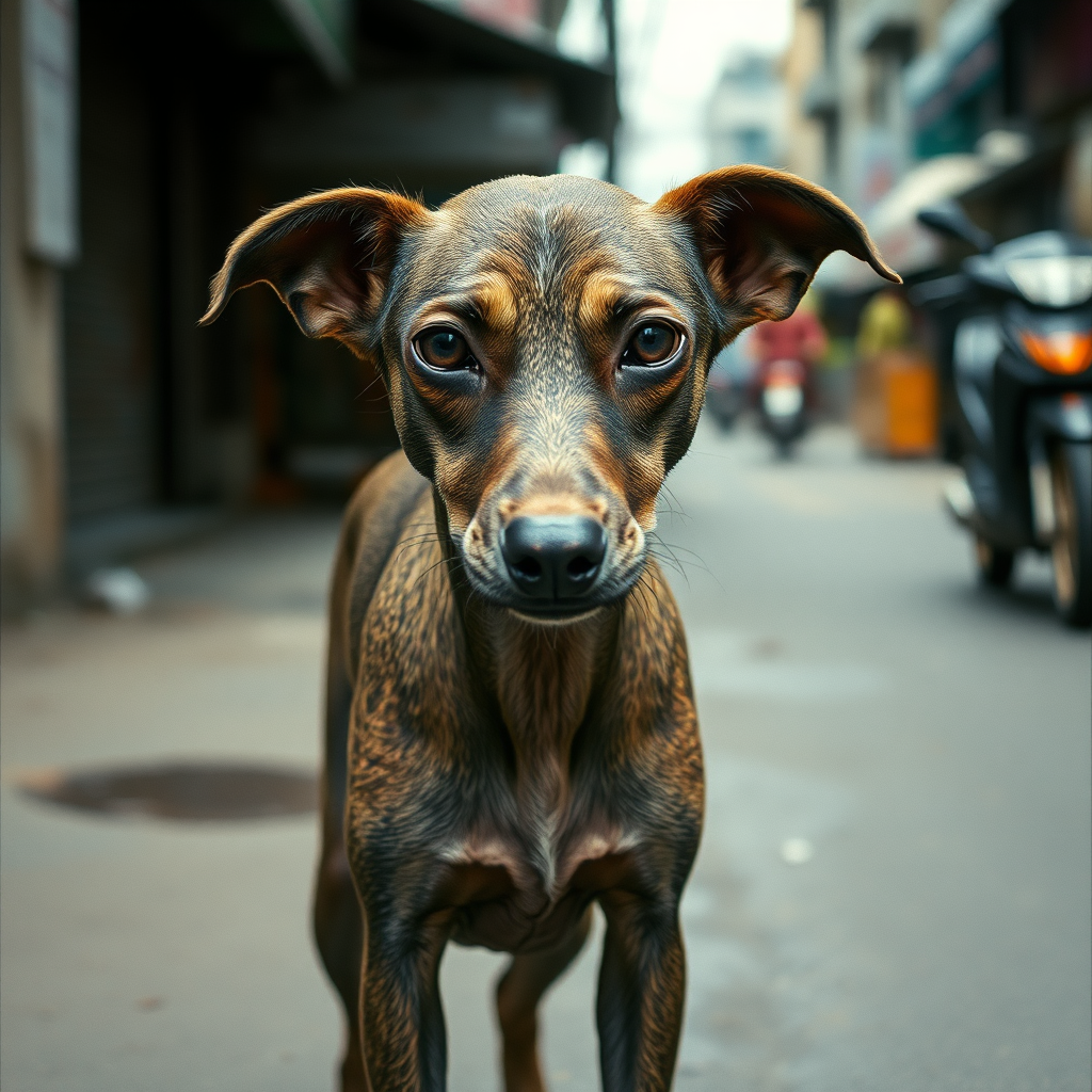A forlorn, emaciated dog stands on a grimy street in Bangkok, its fur matted and unkempt, eyes filled with sadness. The animal appears frail and unwell, casting a desolate figure against the bustling backdrop. It gazes directly at the lens, capturing attention with its poignant expression. The soft illumination of the scene adds an ethereal quality, reminiscent of an image captured on Agfa Vista 200 film. The shot, taken from a frontal perspective, reveals the dog's full stature amidst the chaos around it, evoking a sense of empathy and wonder.
