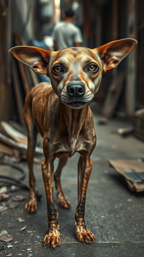 A forlorn stray dog, emaciated and grime-covered, with a skeletal frame and sorrowful eyes, stands on a cluttered and neglected Bangkok alley. Its expression is weary and pleading as it gazes directly into the camera. The scene is bathed in gentle, diffused light, capturing every detail and emotion of the moment. Photographed as if on Agfa Vista 200 film, the image presents a symmetrical view, rich in texture and color, inviting both empathy and contemplation.