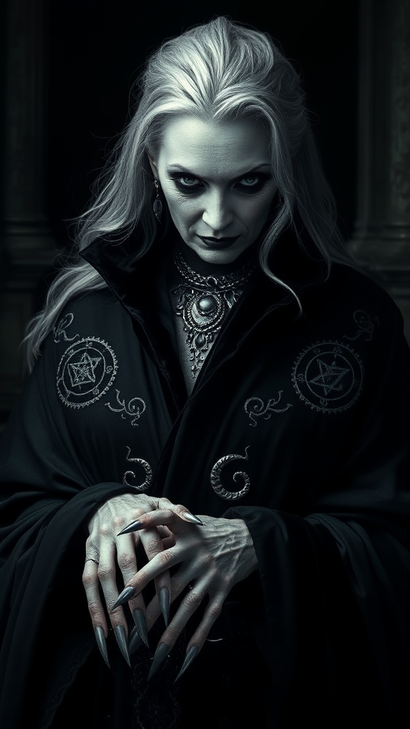 A formidable ancient Strigoi vampire matriarch, exuding an aura of chilling elegance and timeless power, her eyes burning with an insatiable hunger. Her skin, pale as moonlight, contrasts sharply with the flowing ebony robes embroidered with cryptic symbols of bygone eras. Sharp, elongated talons gleam in the subdued light, while her silver hair cascades like a waterfall of starlight. The cinematic scene is steeped in shadowy tones, capturing the intricate details of her regal and menacing presence. This ultra-detailed portrait reveals hints of her dark history etched in the lines of her face, set against a dramatic, high-contrast background that amplifies the eerie, otherworldly atmosphere surrounding her.