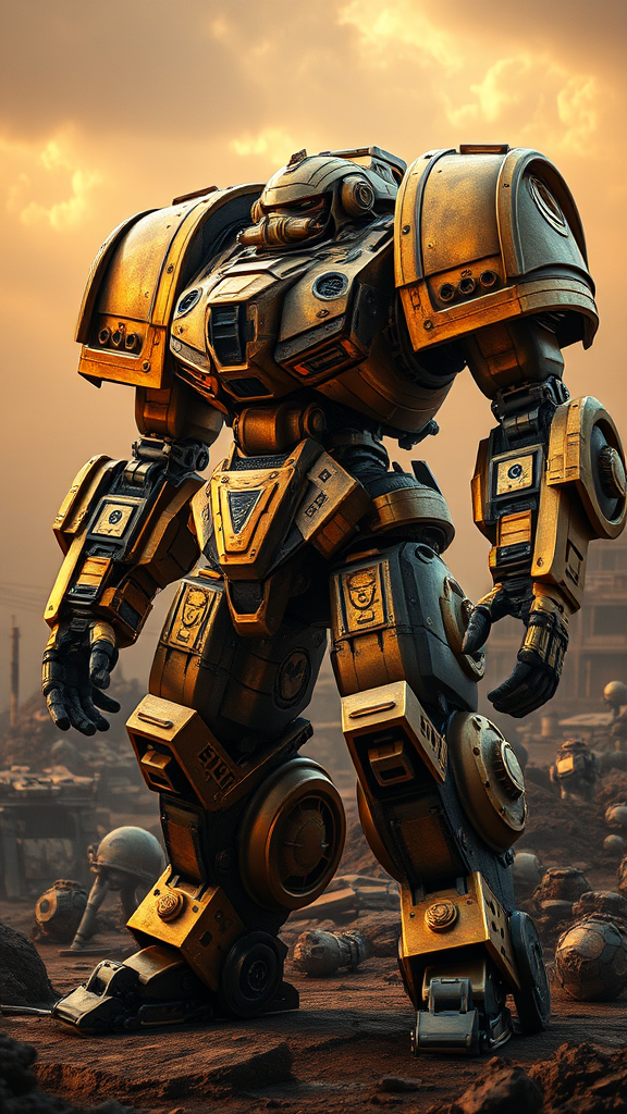A formidable combat robot, intricately designed with well-armored features, stands as a masterpiece. Its structure gleams in golden hues reminiscent of Warhammer 40,000 aesthetics, with an epic realism that captivates the viewer. The scene is hyperdetailed, employing cinematic and warm lighting that casts dramatic shadows across its intricate form. In the background, a complex landscape adds depth to the composition, with elements that evoke a faded elegance. The entire setting is rendered in HDR quality, emphasizing the robot's dominance in this striking tableau.