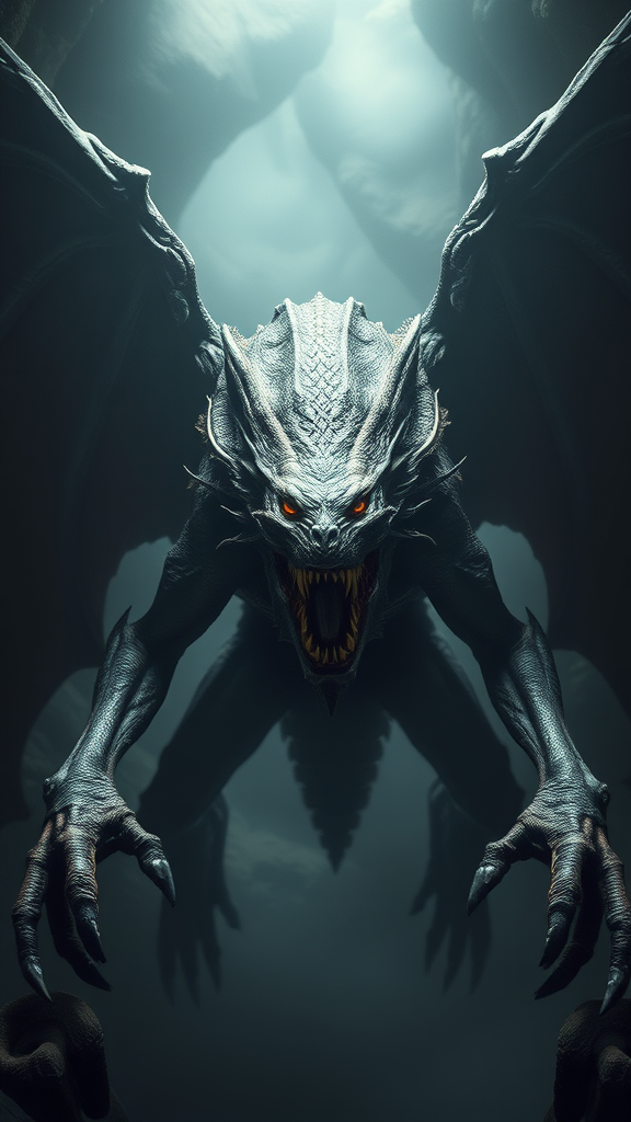 A formidable extraterrestrial beast with expansive bat-like wings and a shadowy, fur-covered torso, possessing elongated limbs ending in menacing claws. Its grotesque visage boasts a predatory maw lined with dagger-like teeth, emerging ominously from a mist-laden shadowy cavern. Its lethal amber eyes glow with a sinister intensity, embodying the essence of cosmic horror. The creature's form is rendered in intricate detail, shrouded in dramatic lighting, capturing a photorealistic and cinematic presence with subtle cinematic noise, in ultra-high resolution.