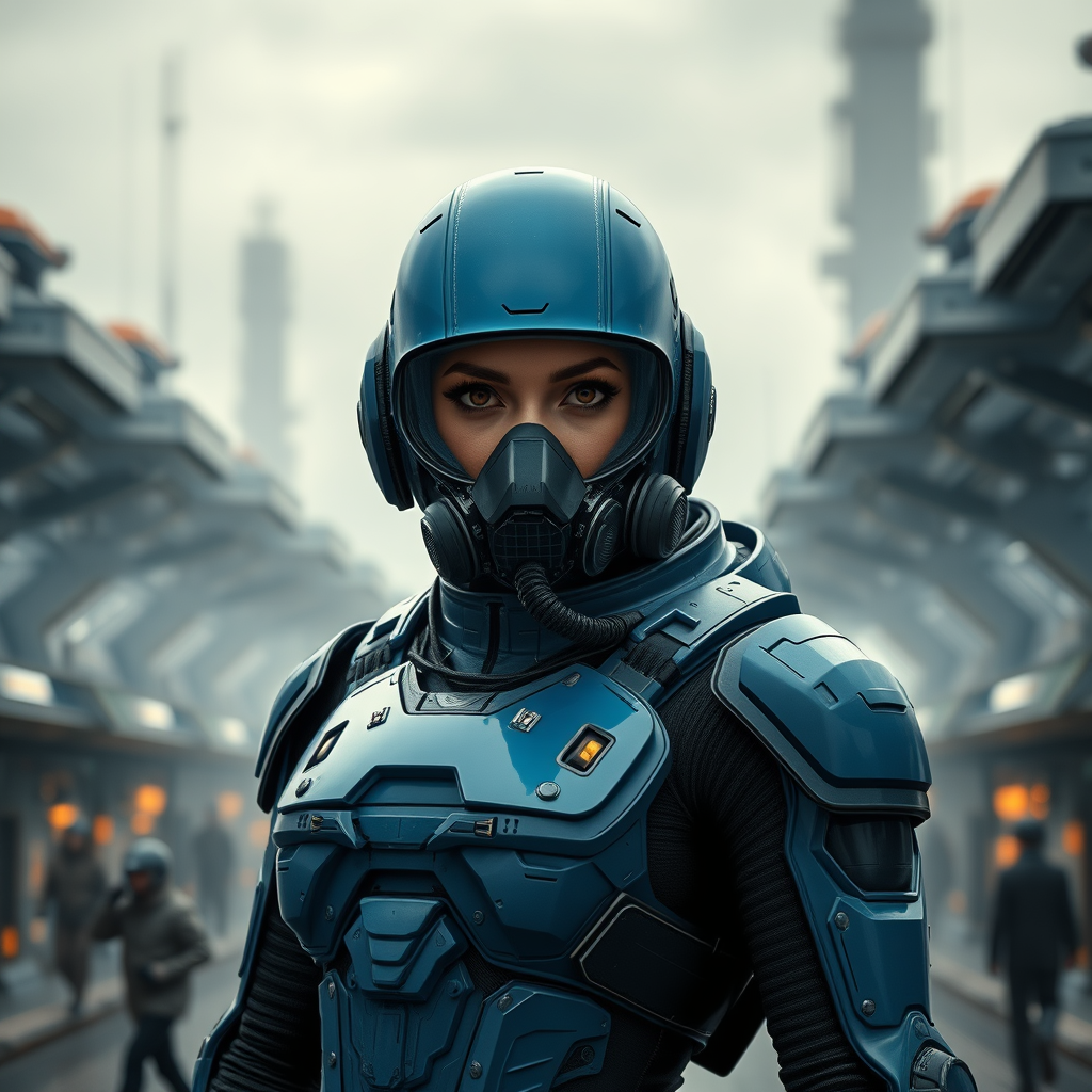 A formidable female figure clad in a sleek blue sci-fi spacesuit stands in a bustling spaceport, surrounded by hovering futuristic platforms. The environment is cast in an overcast atmosphere, adding a dramatic flair. Her enigmatic face is partially concealed by a sci-fi visor and advanced respirator, enhancing her mysterious allure. With a bald head and intricate plate armor, her attire blends isolated armor segments with advanced design. Captured from a third-person perspective, the scene is rich with fine detail, merging the aesthetics of a sci-fi movie with photorealistic elements. The composition boasts natural textures and lighting, complemented by subtle motion blur and cinematic enhancements. Employing ray tracing techniques, the scene is rendered in ultra-high quality, ensuring a striking 8K resolution with moody and cinematic lighting that immerses the viewer into this futuristic setting.