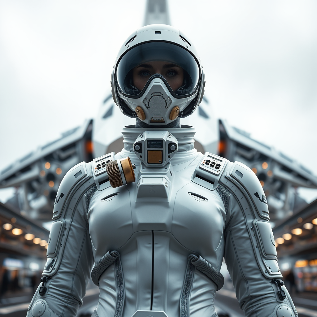 A formidable female figure clad in a sleek white futuristic spacesuit stands on a bustling spaceport. Behind her looms an intricate sci-fi spacecraft, partially obscured by the overcast sky. She wears a high-tech visor with multi-layered lenses and a sophisticated respirator. Her head is bald, and she is partially protected by gleaming plate armor that integrates seamlessly with the isolated sections of her suit. The perspective is from below, showcasing her as a dominant presence with intricate detailing throughout her attire. The scene embodies the aesthetic of a sci-fi movie with photography-inspired natural textures and lighting, employing subtle blur and cinematic rendering to achieve photorealism. Using innovative cinematic lighting and ray tracing to accentuate reflections, it emphasizes depth and mood. Captured in 8K Ultra-HD, the composition is portrayed with long exposure for a resonant blur effect, achieving the highest quality and detail with moody, evocative lighting.