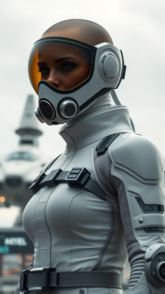 A formidable female figure clad in a sleek white sci-fi spacesuit stands poised on a bustling spaceport with a futuristic spacecraft looming in the backdrop. The sky is overcast, casting a moody ambiance. Her face is partially obscured by a sophisticated mask with a reflective sci-fi visor and intricate lens, complemented by a high-tech respirator. Her bald head is accentuated by gleaming plate armor and isolated armor pieces, giving her a strong, commanding presence. The scene is captured from a low, third-person perspective, emphasizing her imposing stature. The image is rich with fine detail, reminiscent of a sci-fi movie style, offering a photorealistic quality with natural textures and cinematic lighting. The use of ray tracing and long exposure adds a dynamic blur effect, creating a high-quality, ultra-detailed 8K Ultra-HD image with natural and moody lighting that elevates the cinematic experience.